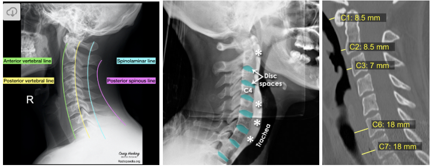 S - Soft tissue - examine the prevertebral soft tissue (narrower 5-10mm from C1-C4 and thickens starting C5 due to esophagus lying anteriorly) since soft tissue swelling my point towards a fracture