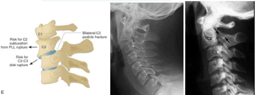 Also known as traumatic spondylolisthesis of the axis, but the term “hangman’s fracture” is misleading since this injury is more likely to result from MVC or fall