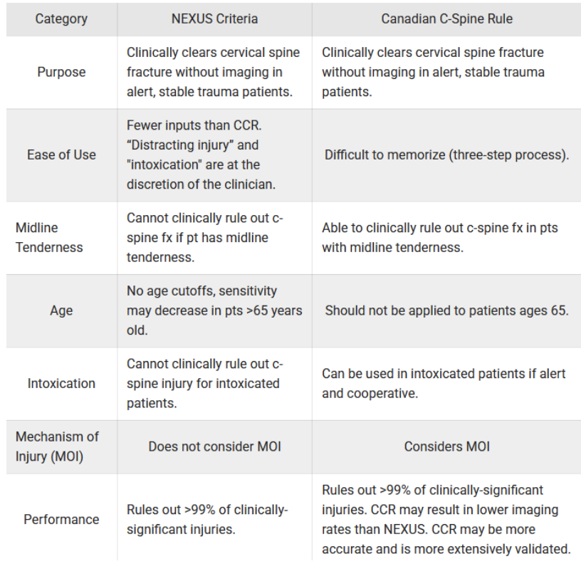 Both NEXUS and CCR can help physicians rule out c-spine fractures. NEXUS is simpler, but CCR is more well validated and can be applied to patients with midline tenderness. They each have their pros and cons that need to be taken into consideration when using them. A summary of the differences between the two can be seen in the table below: