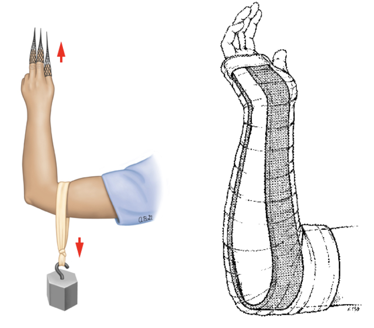 The technique used for fracture reduction will depend on the type of distal radius fracture. However, the main goal is to recreate and then reverse the mechanism of injury. Prior to reduction, finger traps are used to provide traction and hang the arm with the elbow 90-degree flexion and the forearm in neutral position. Weights are also placed on the distal humerus to provide counter-traction. This technique helps to relax the muscles prior to reduction.