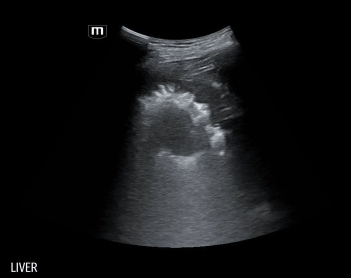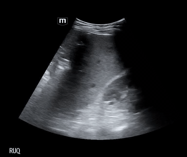 Using the curvilinear probe, we see a well-defined, round lesion within the liver parenchyma on the right lower quadrant US: