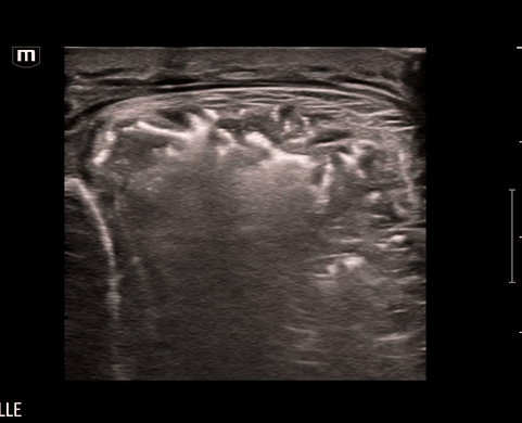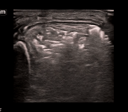 A – Air: posterior dirty acoustic shadowing, corresponding to gas in the soft tissue