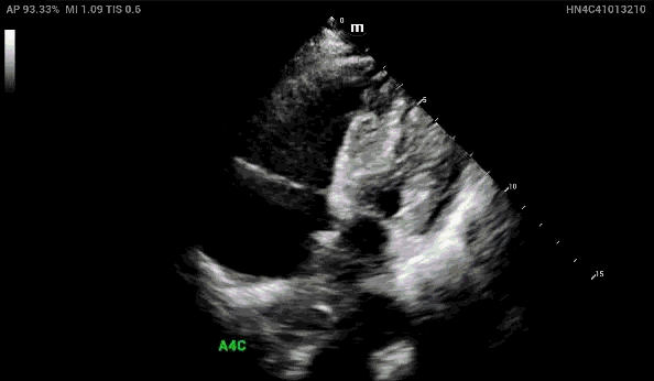 In the apical 4 chamber view, again demonstrated is the dilated right heart concerning for right heart strain.