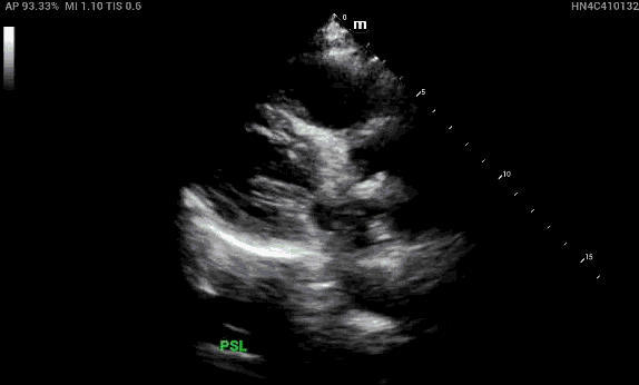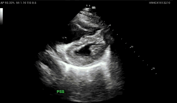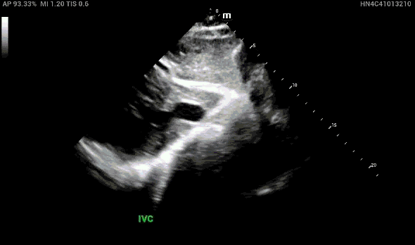 In the parasternal short view, notice that the right ventricle is enlarged compared to the left ventricle. Also, there is bowing of of the interventricular septum during diastole, aka “D sign” — this is concerning for right heart strain.