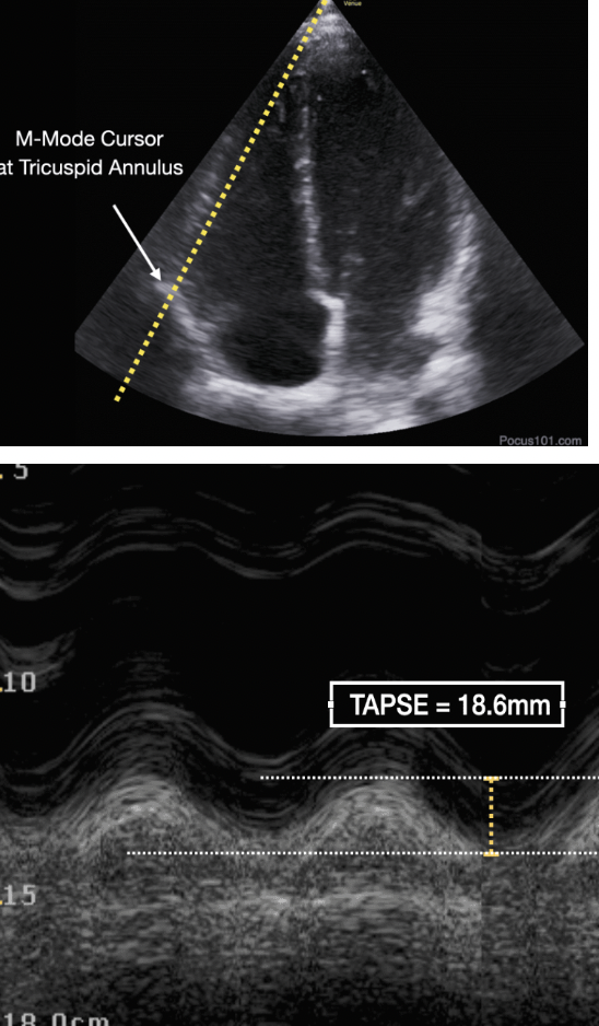 If TAPSE is less than 16mm, it suggests there is right ventricular systolic dysfunction. This can be seen in the setting of PE as well as chronic processes such as pulmonary hypertension, right ventricular MI, etc.